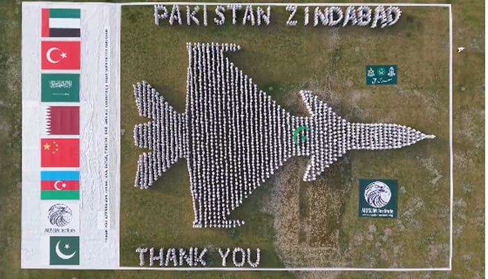 Jhang: In a powerful show of unity and patriotism, thousands of citizens gathered at the Shrine of Hazrat Sultan Bahoo in Shorkot, Jhang, to create a spectacular human formation of the J-10C fighter jet — a tribute to the Pakistan Air Force (PAF) and the nation’s strategic allies following Pakistan’s decisive military response to Indian aggression.
